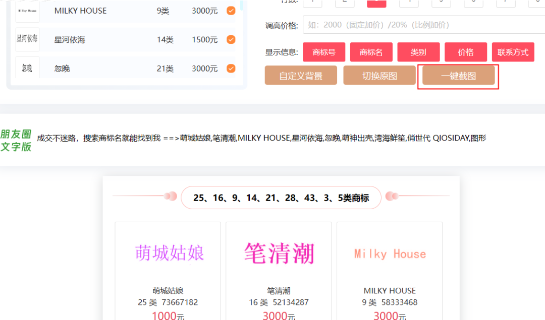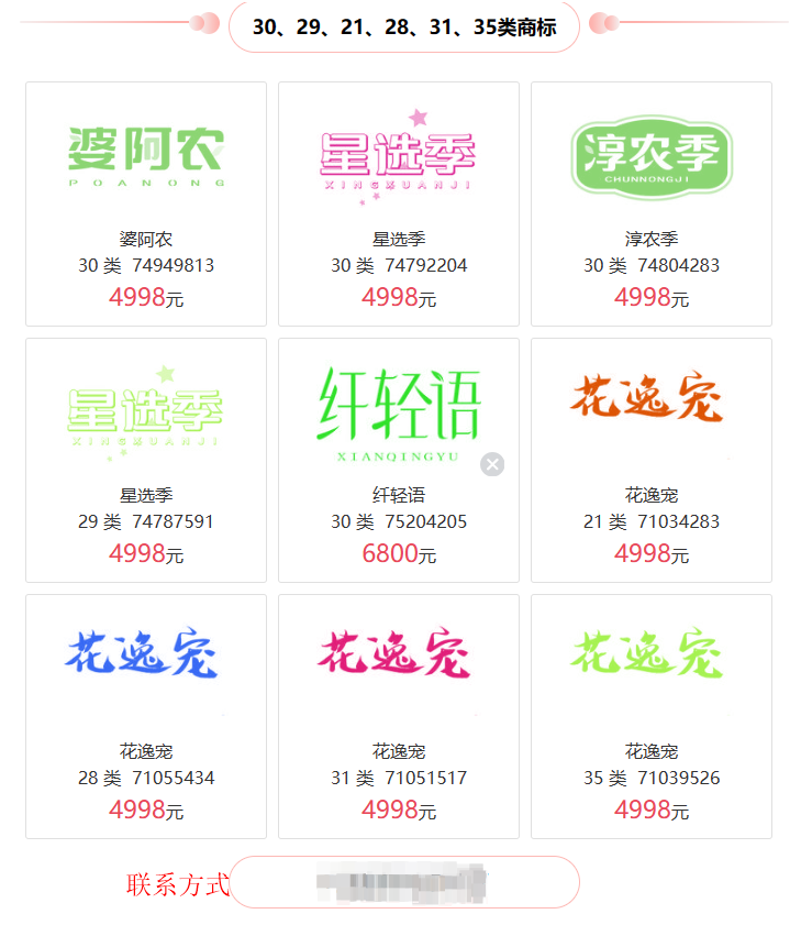 内容自定义:除了默认的商标图片外,您还可以选择是否显示商标名称、价格、类别等信息,还有联系方式。