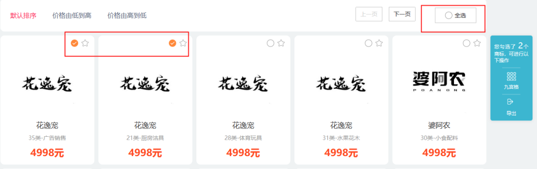 手动与全选:在商标列表中,您可以手动选择需要的商标,或点击“全选”按钮选择整页商标。