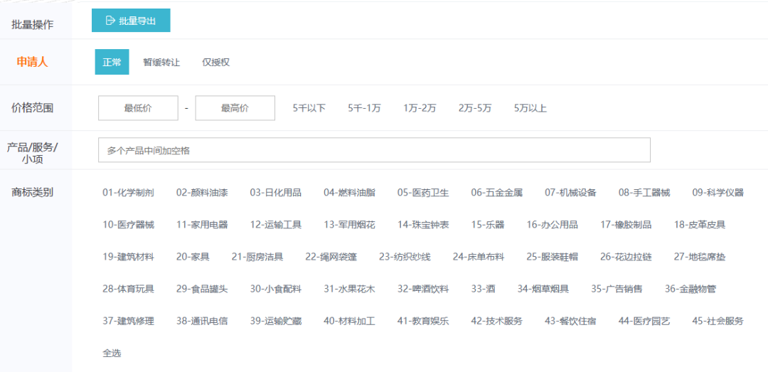 分类与价格筛选:您也可根据商标分类和价格区间,筛选出符合您需求的商标。