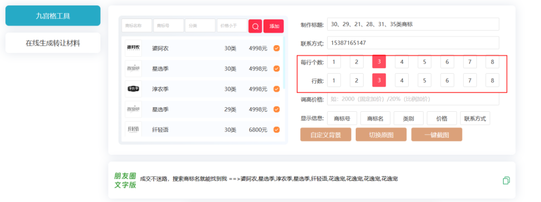 选择完毕后在页面右端,点击“九宫格”,进入到制作页面,可对当前选择的商标生成宫格图片。